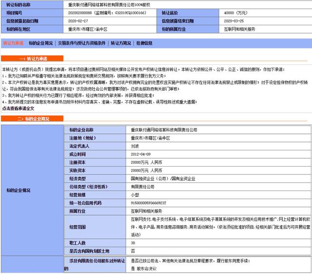 2020年2月27日,重庆产权买卖业务网发布的公告显示,第三方支付公司重庆联付通网络结算科技有限责任公司挂牌转让其100%股权,转让底价为4亿元。该成立于2012年,注册资本2亿元,持有互联网支付牌照。股东为重庆团结产权买卖业务所与重庆渝富资产经营管理团体,分别持股75%、25%。