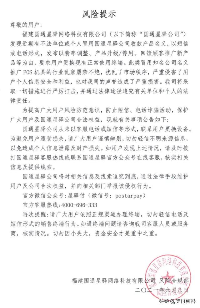 国通星驿也在风险提示中提到,发现有不法单位或个人冒用国通星驿名义,以短信或电话形式,发布以费率调整、产品升级/停用、回馈客户推广新产品为由,要求用户更换现有正常利用的POS终端。